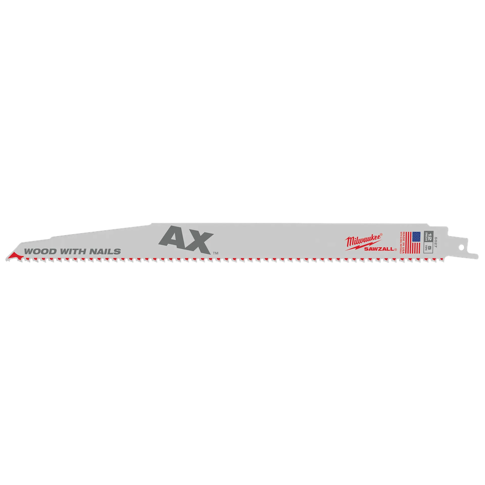 The Milwaukee 12' 5 TPI The Ax Sawzall Blade is specifically engineered to deliver the fastest cuts and longest life in demanding wood demolition applications. Featuring the specialized Nail Guard tooth pattern, these blades provide unmatched speed while protecting against tooth fracture when hitting nails. The unique Fang Tip design allows for instant biting into the wood on first contact, facilitating rapid plunge cuts without the blade bouncing or skating. These blades are built with a thicker, more rigid body to resist bending and ensure straighter, more accurate cuts in the toughest jobsite conditions.