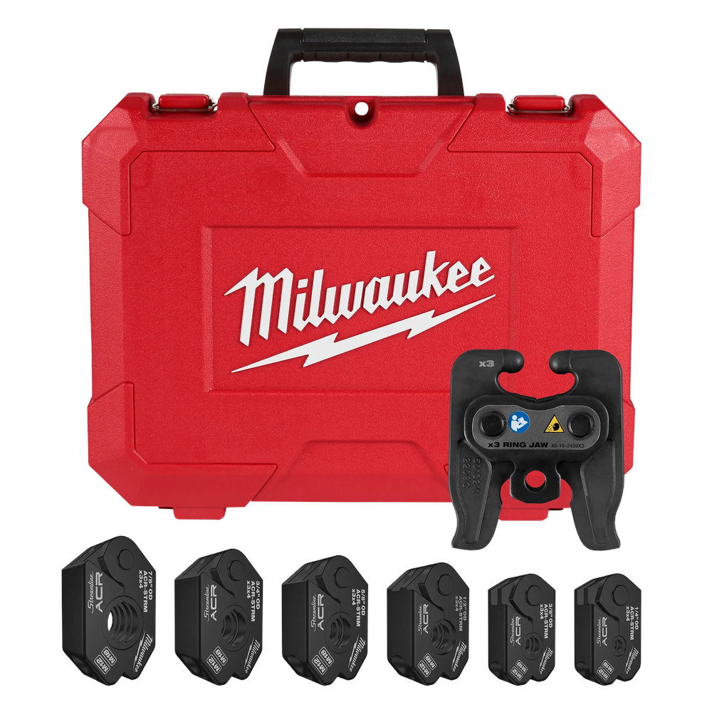 The Milwaukee ACR Pivoting Press Rings are a more efficient alternative to traditional sweat and solder methods for connecting copper tubing, allowing for flameless connections. Designed for use with both M18 & M12 FORCE LOGIC Press Tools, these rings offer pivoting functionality which provides greater access in tight spaces. This system is engineered to provide quality, reliable press connections, which can be up to 60% faster than brazing. The press blocking system helps prevent improper ring and jaw mismatch, ensuring peace of mind with quality connections.
