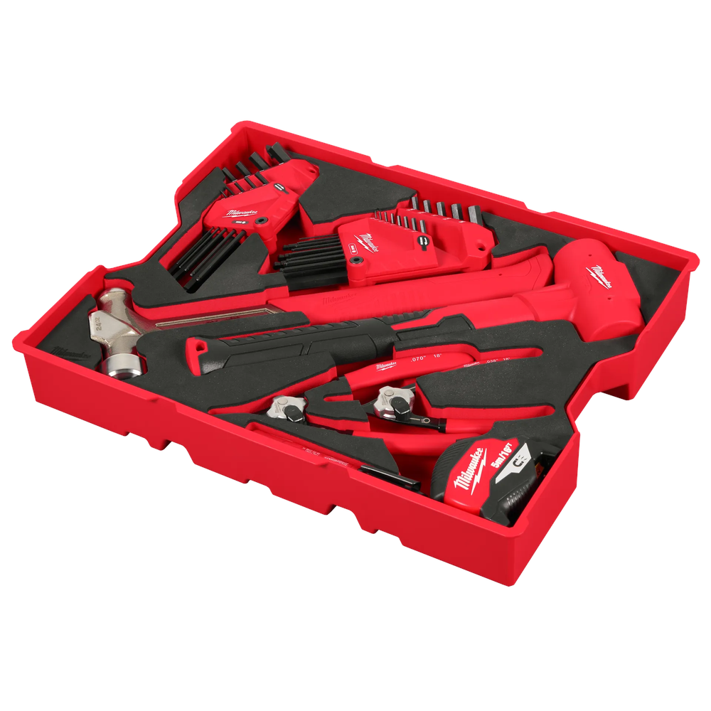 The MILWAUKEE 28pc Hex Key & Hammer Set with Tray is engineered for ultimate organization and professional performance within the PACKOUT ecosystem. This comprehensive kit features heavy-duty hammers, including a vibration-reducing ball peen hammer and a maximum-impact dead blow hammer, alongside precision L-style hex keys and convertible snap ring pliers. The included reinforced EVA foam tray provides high-contrast tool identification and is specifically designed to fit seamlessly into Milwaukee PACKOUT Drawer Tool Boxes, ensuring your essential tools are always accessible and secure.