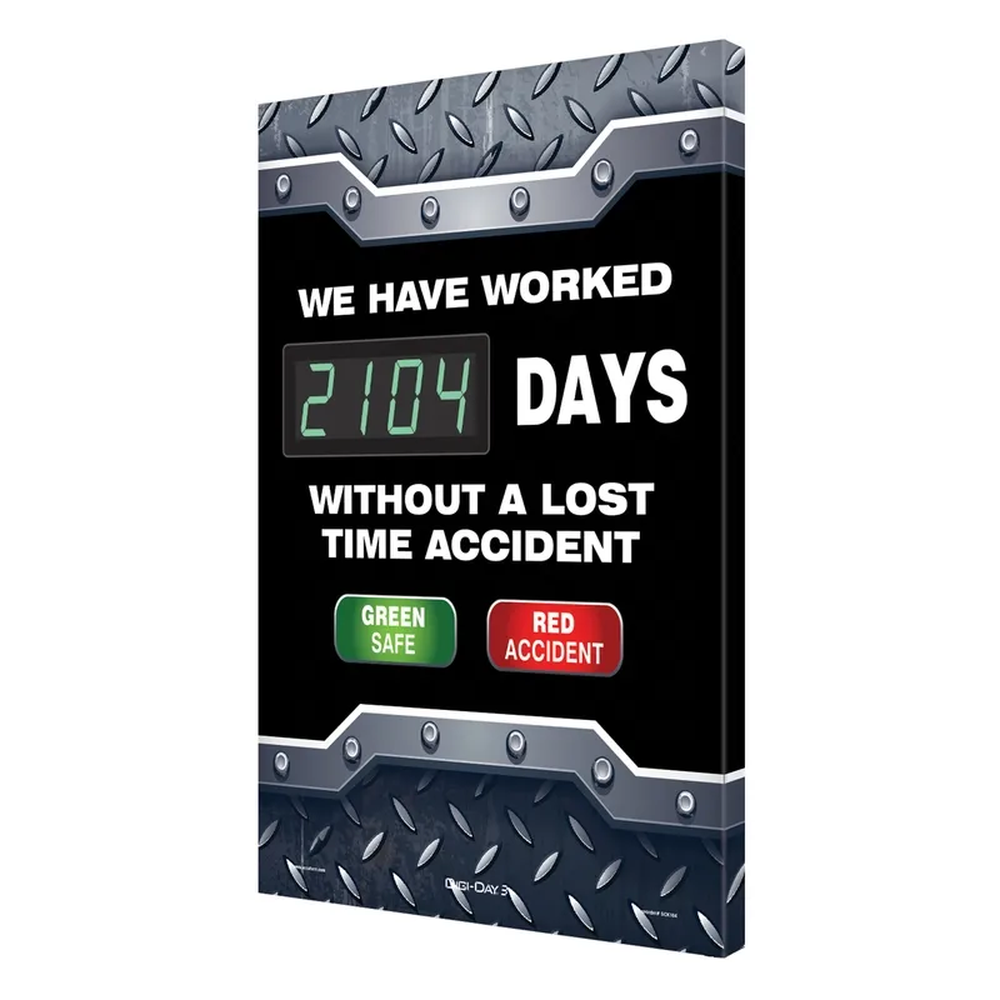 The upgraded Digi-Day electronic scoreboard displays days without lost time accidents. It features a low-profile design and can control up to 5 displays with one remote.