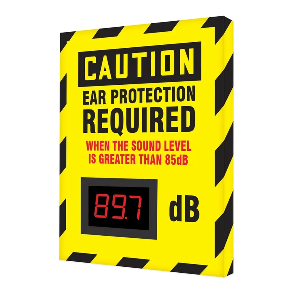 Electronic decibel meter sign that constantly measures and displays decibel levels to alert workers of the need for ear protection. Supports OSHA 1910.95 hearing conservation program.