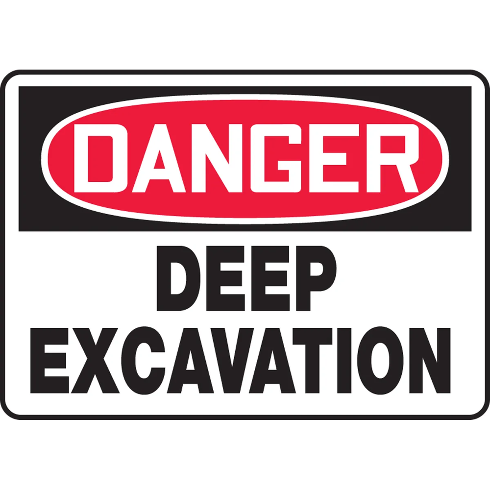 This OSHA Danger safety sign warns of possible falling dangers around deep excavation areas. It should be posted in conspicuous areas to indicate hazardous zones and falling dangers.
