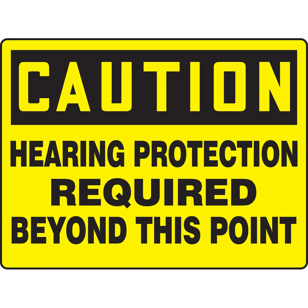 Warns of hearing protection requirement beyond this point