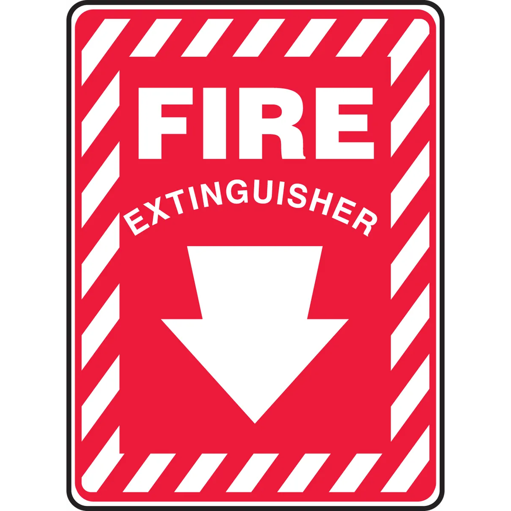 Red and white sign with bold arrow draws attention to the location of a fire extinguisher. Identifies where the fire extinguisher is located with big arrow graphic suggesting it's right below.
