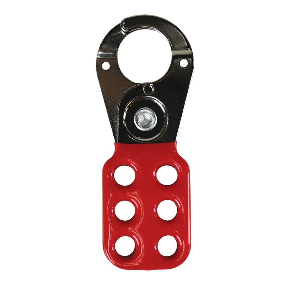 Standard style steel hasp with red vinyl coating on zinc-plated steel. Available with 1 1/2-inch diameter opening for lockout applications.