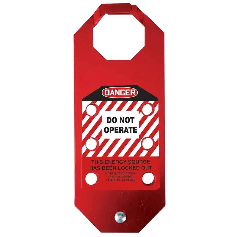 Scissor-style hasp comprised of two high-strength aluminum pieces designed to lock out more equipment in tough environments. Features a recognizable tag shape with bold lockout hazard message labels on both sides.
