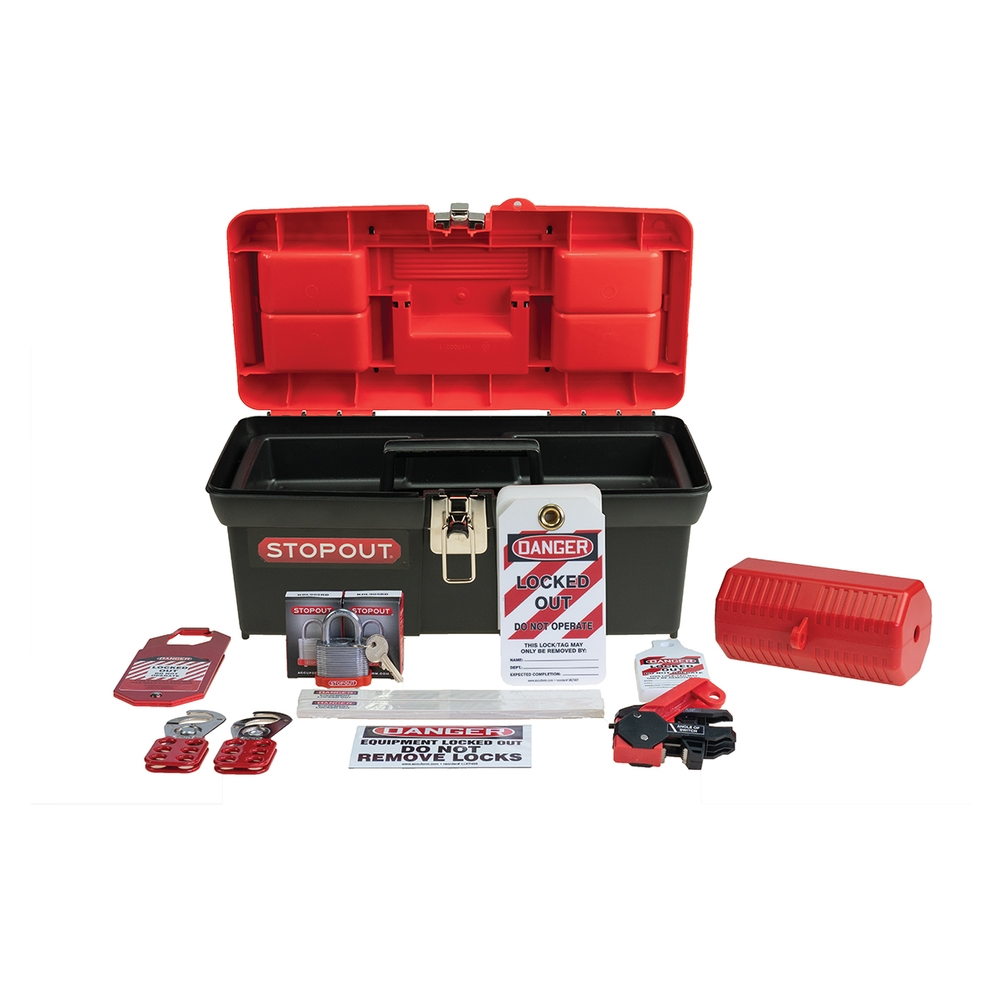 This lockout kit contains a variety of devices and accessories for shutting down equipment and machinery before maintenance or repairs. It helps comply with OSHA safety lockout requirements.