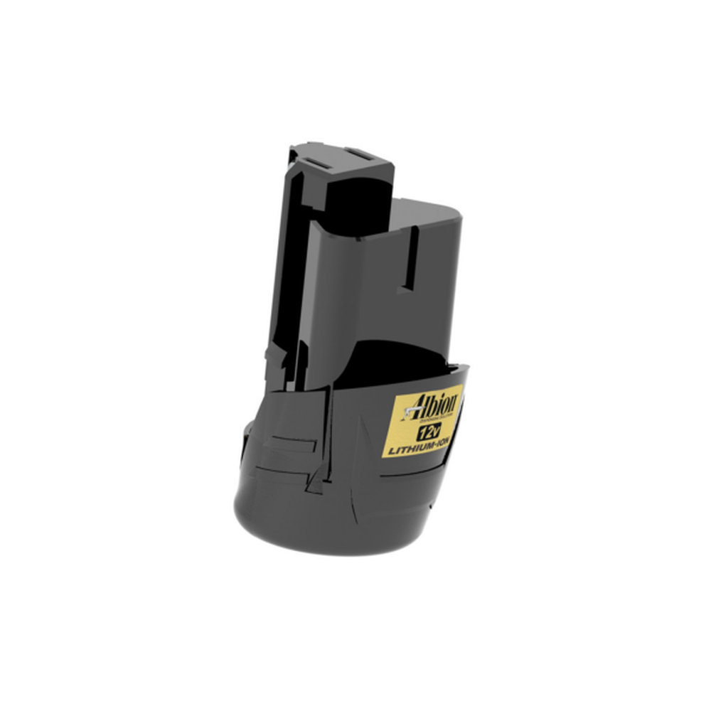 Compact battery pack designed for Albion Engineering's 12V Lithium-Ion cordless guns. It features 2.0 amp hours capacity and uses Milwaukee REDLITHIUM battery technology.