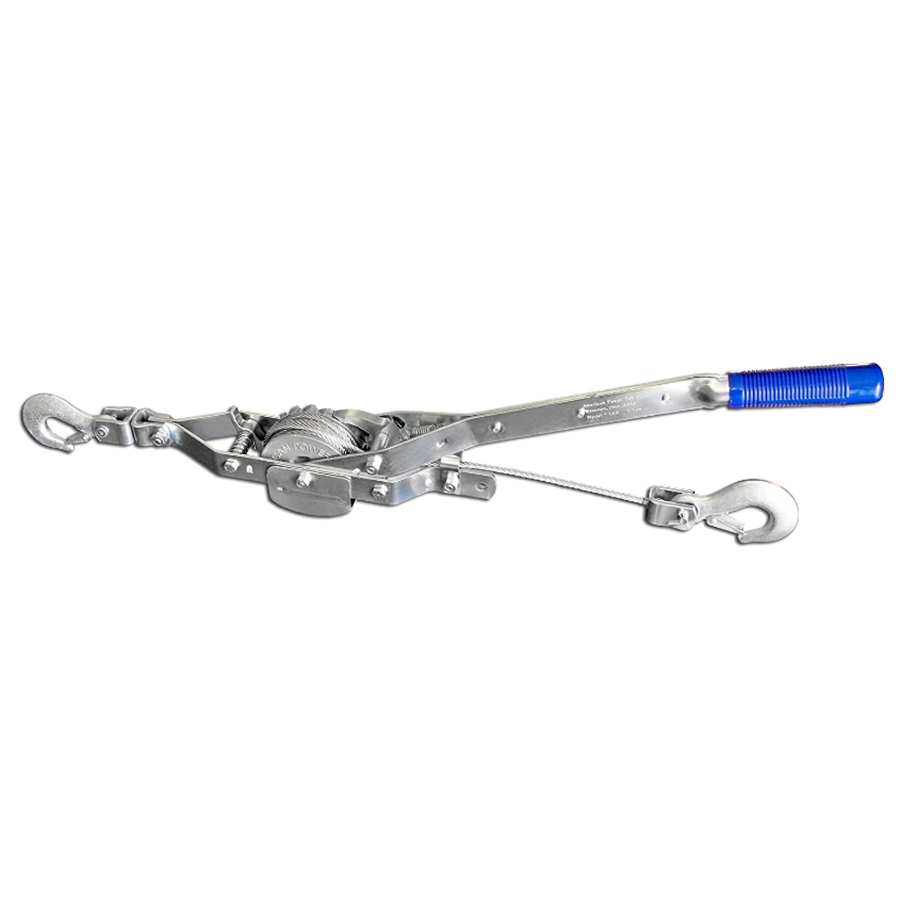 American Power Pull One Ton Power Pull has a 12 foot pull, 3/16" galvanized aircraft cable, cast aluminum ratchet wheel, cable limiter, zinc plated steel frame/steel parts and contour grip. Releases load one notch-at-a-time makes tough projects an easy, one-person job. The puller has longer cable life and rust resistance. Made in USA.
