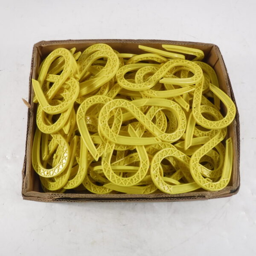 100 pack of Carnie Quick S Hooks designed for extension cord safety. These yellow plastic hooks provide secure cord management.