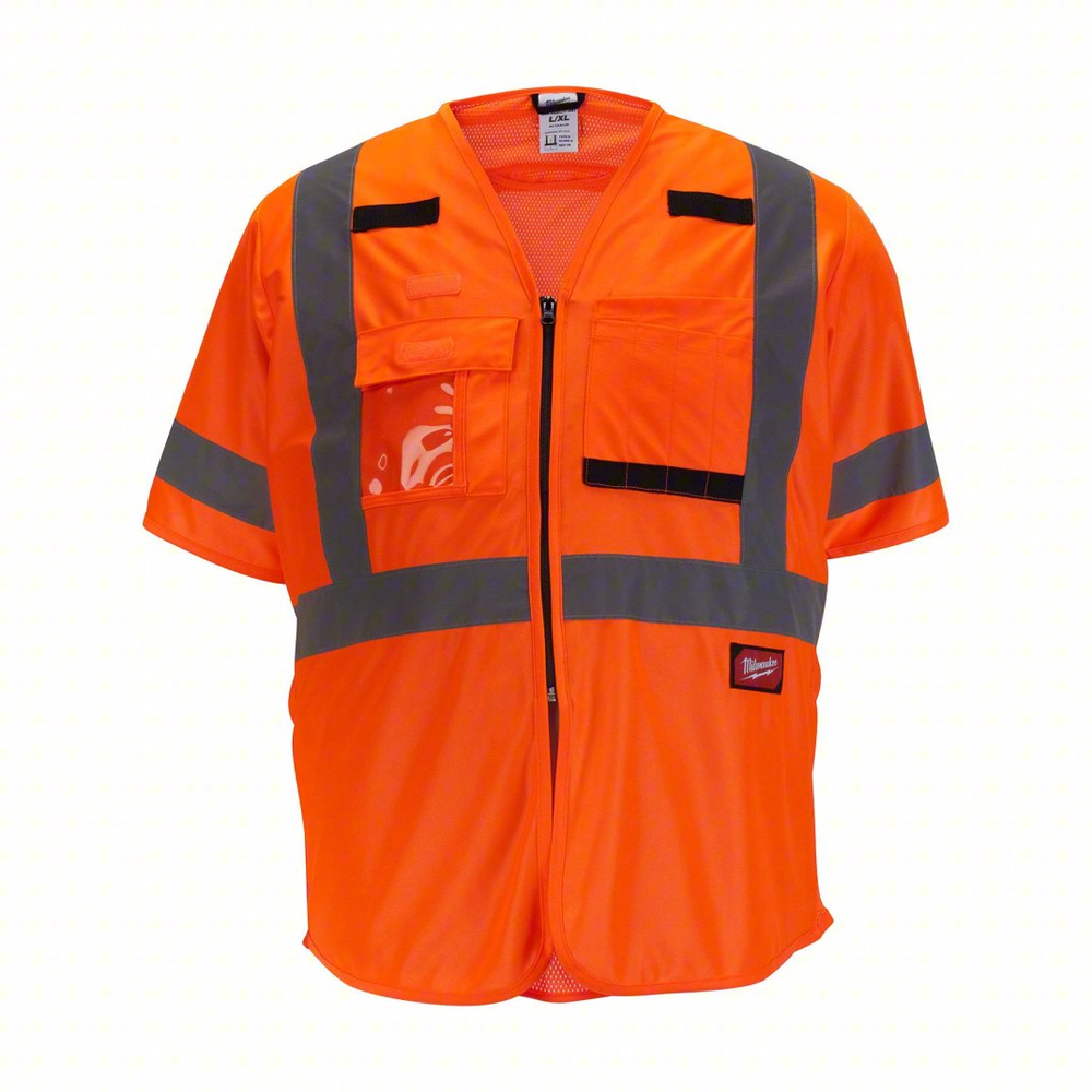 The MILWAUKEE 4XL/5XL Orange ANSI Type R Class 3 High Visibility Safety Vest is engineered for workers in environments with traffic exceeding 50 mph or around heavy machinery, offering enhanced visibility and functionality. This vest is designed to carry more, featuring 10 pockets for ample storage, including a clear ID holder and an internal pocket. It includes a quick internal size adjustment for a better fit over a t-shirt in the summer or a jacket in the winter, and a durable pass-through for fall protection gear, ensuring both convenience and safety on the jobsite.