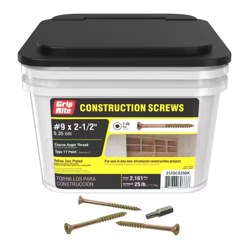 Grip-Rite 212GCS25BK #9 x 2-1/2 in. Star Drive Dual Flat Head Coarse Thread Construction Screws feature a T17 point which means you won't need to pre-drill during construction. Designed for interior, wood to wood applications, the coarse auger threads reduce splitting and speed installation. The star drive reduces slippage and handles more torque than other designs. Yellow zinc coating combats corrosion and adds an attractive color to wooden construction applications.