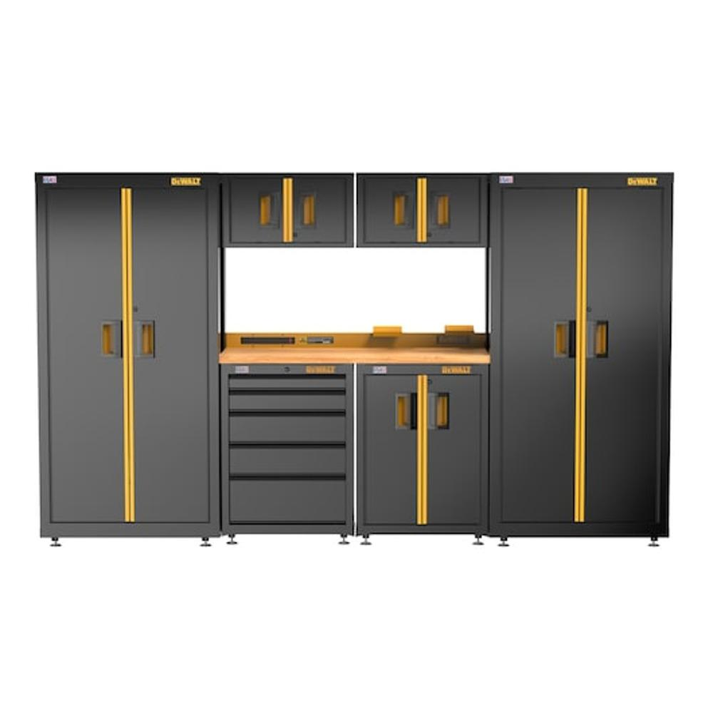 Transform your workspace into an organized haven with this impressive 126-inch wide, 7-piece welded storage suite. Featuring two door and five drawer base cabinets topped with a durable wood surface, this collection is expertly crafted in Sedalia, Missouri, USA, using global materials. It's the perfect starting point for any workshop or garage needing a serious declutter. Built with robust, welded steel, this suite arrives almost fully assembled, saving you valuable time and effort. Choose from five distinct configurations to perfectly suit your needs.