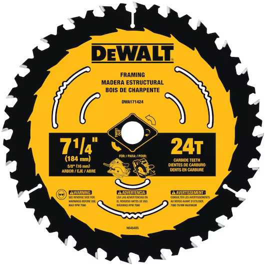 DEWALT Saw Blades are ideal for any wood-cutting application. The exclusive, patent-pending ToughTrack™ tooth design, on our framing & ripping blades, is engineered to deliver straight, accurate cuts over the life of the blade. Patented Body Slots reduce vibration, which works with the blade's thin kerf design to deliver exceptional user feel. High-Density Tungsten Carbide teeth are tough, wear-resistant, and provide long life. The reinforced shoulder is designed for strength & durability by providing impact resistance, especially in nail-embedded wood. These blades come with ToughCoat™ anti-stick coating to reduce friction and gumming. Optimized for use on both corded and cordless circular saws.