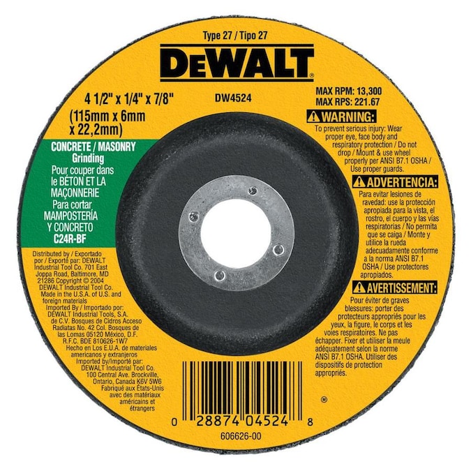 Powered by a high concentration of 100% virgin silicon carbide grain, DEWALT Type 27 Masonry Grinding Wheels deliver aggressive grinding action and smooth-running wheels. 3 full sheets of fiberglass help to increase durability and safety. A proprietary design ensures long wheel life.