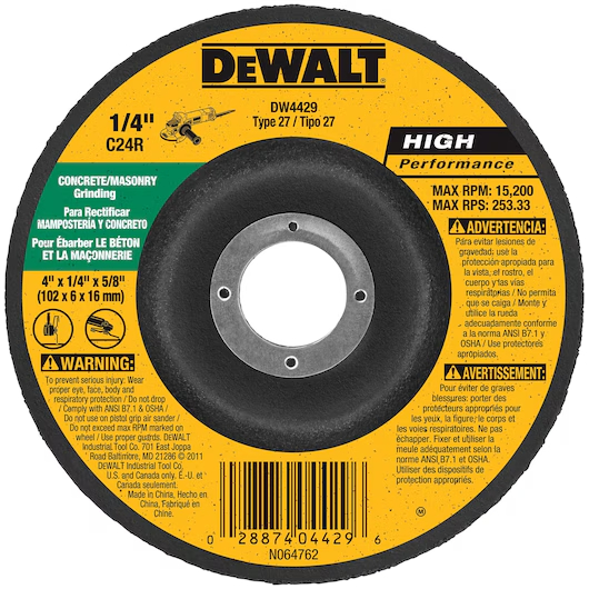 Powered by a high concentration of 100% virgin silicon carbide grain, DEWALT Type 27 Masonry Grinding Wheels deliver aggressive grinding action and smooth-running wheels. 3 full sheets of fiberglass help to increase durability and safety. A proprietary design ensures long wheel life.