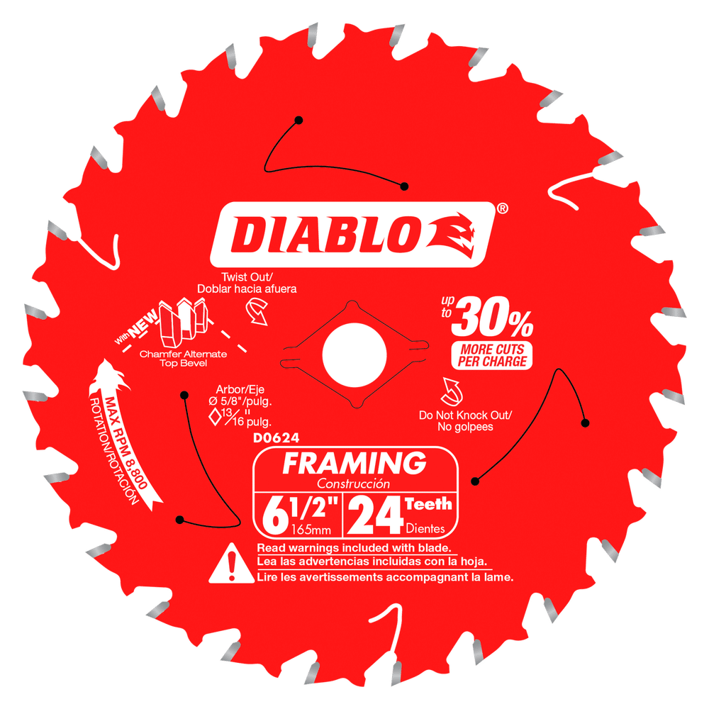 Diablo’s next generation 6-1/2 in. 24-teeth Tracking Point saw blade features the first ever, Tracking Point tooth design and an enhanced anti-vibration design. Diablo’s Tracking Point tooth design delivers maximum life and durability with effortless cutting performance for 5X longer life, 2X more durability and increased stability. This is the only 6-1/2 in. saw blade in the market to include Tracking Point tooth design; making it ideal for framers, roofers, remodelers, concrete formers or anyone wanting ultimate cutting performance in pressure treated wood, 2x lumber, plywood, hardwoods and softwoods.