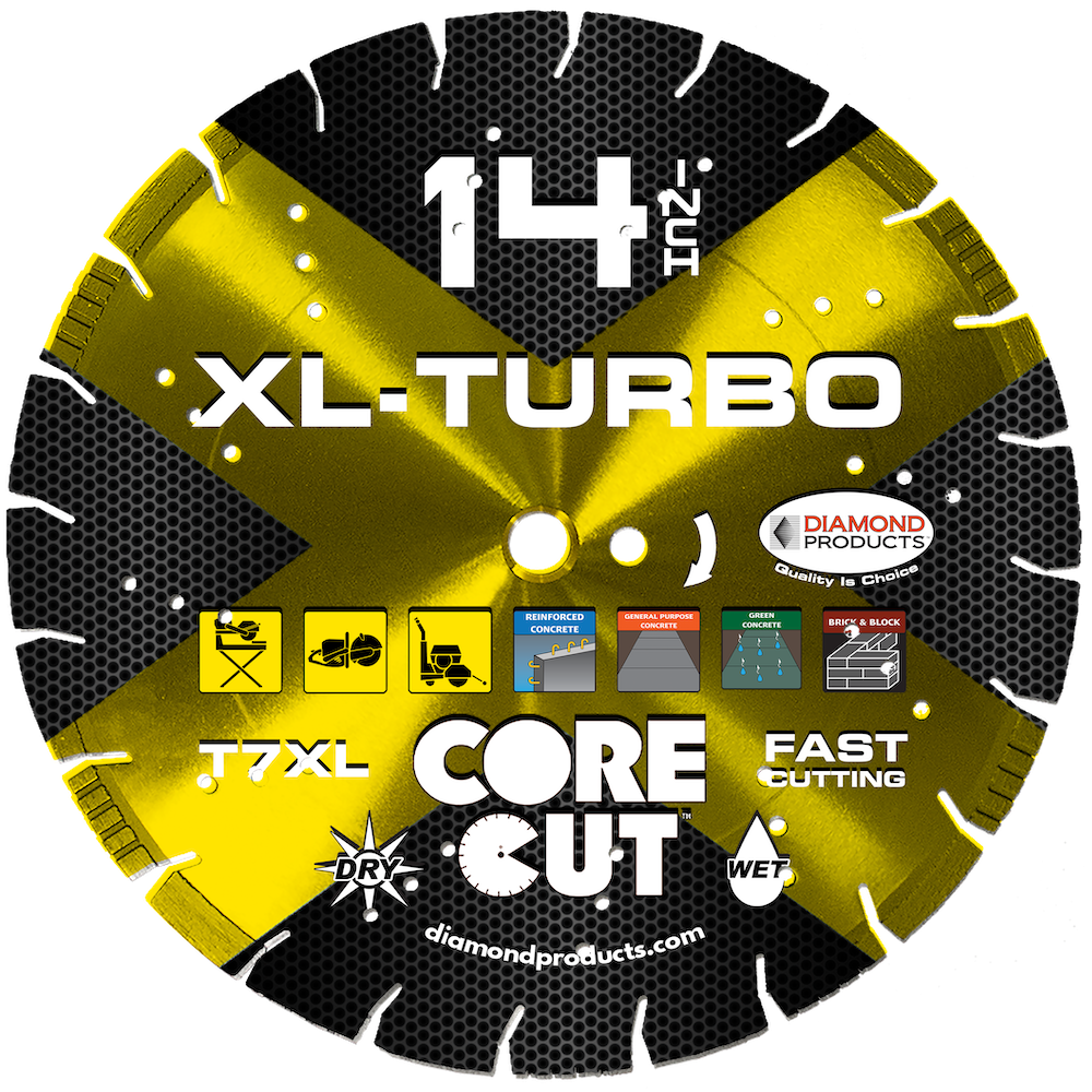 XL-Turbo diamond blade with unique turbo core and extra air holes for cooling at higher speeds. General purpose super fast cutting blade with extended cutting life.