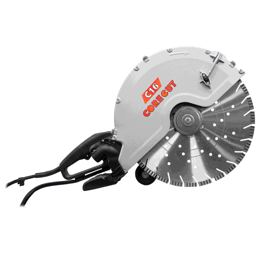 A 16 inch blade capacity electric hand saw designed for flush cutting with wet or dry operation. It features overload protection, tool-free blade guard adjustment, and a standard water feed system.
