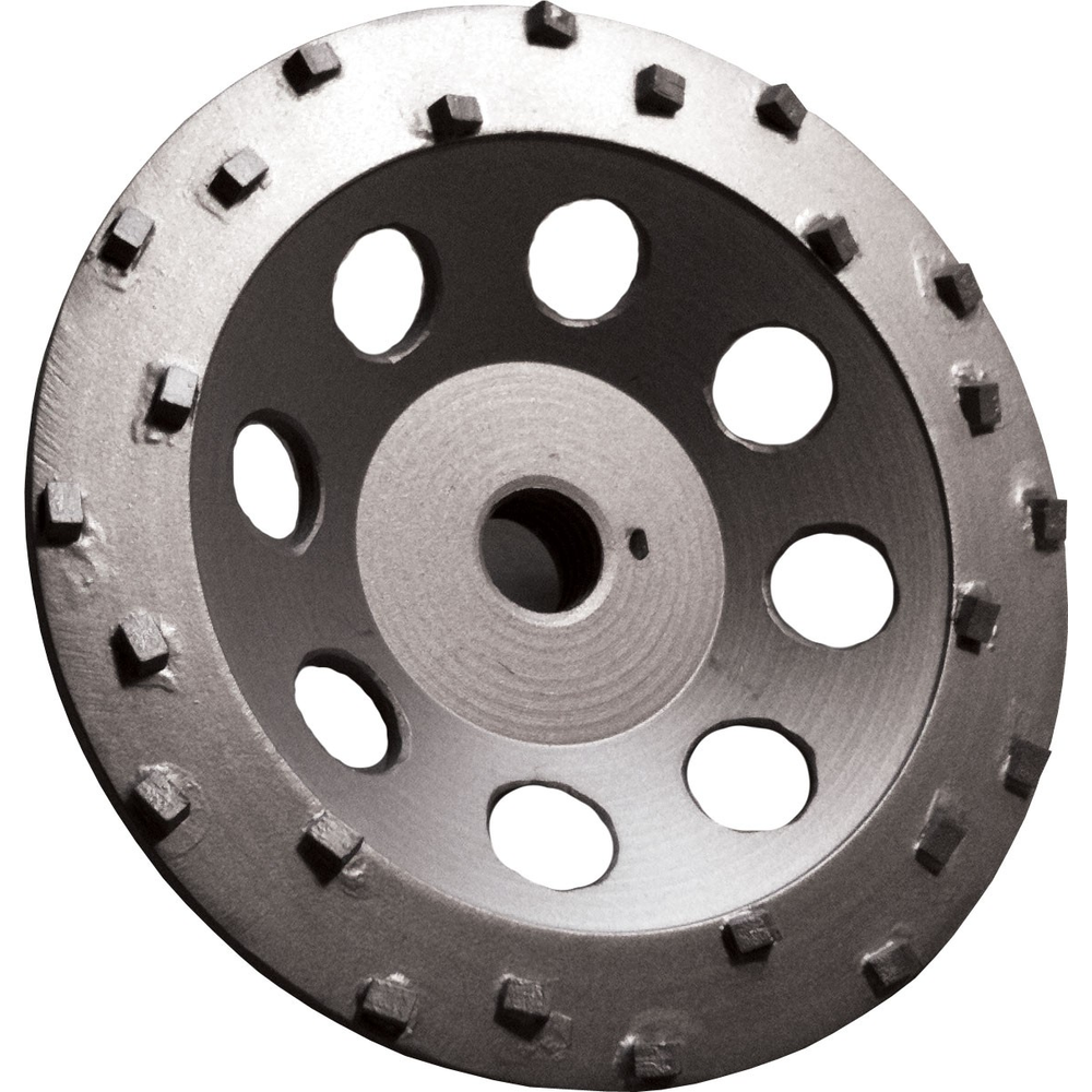 Polycrystalline Diamond cup grinder for aggressive removal of glue, epoxy, and grout. This 4-1/2 inch model features a 5/8 inch-11 thread pattern.
