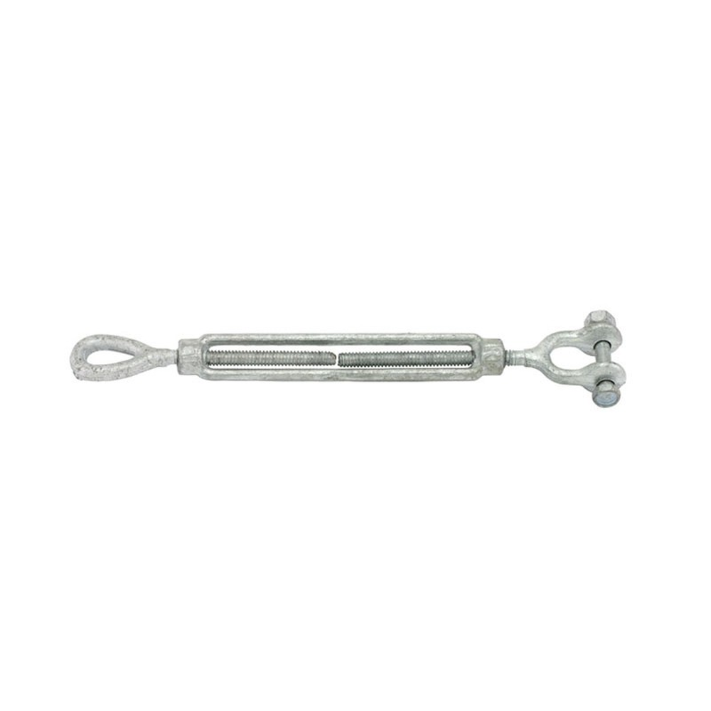 This drop forged turnbuckle is designed for tensioning and adjusting chain, cable, wire rope, or bracing assemblies, featuring a jaw on one end and an eye on the other.