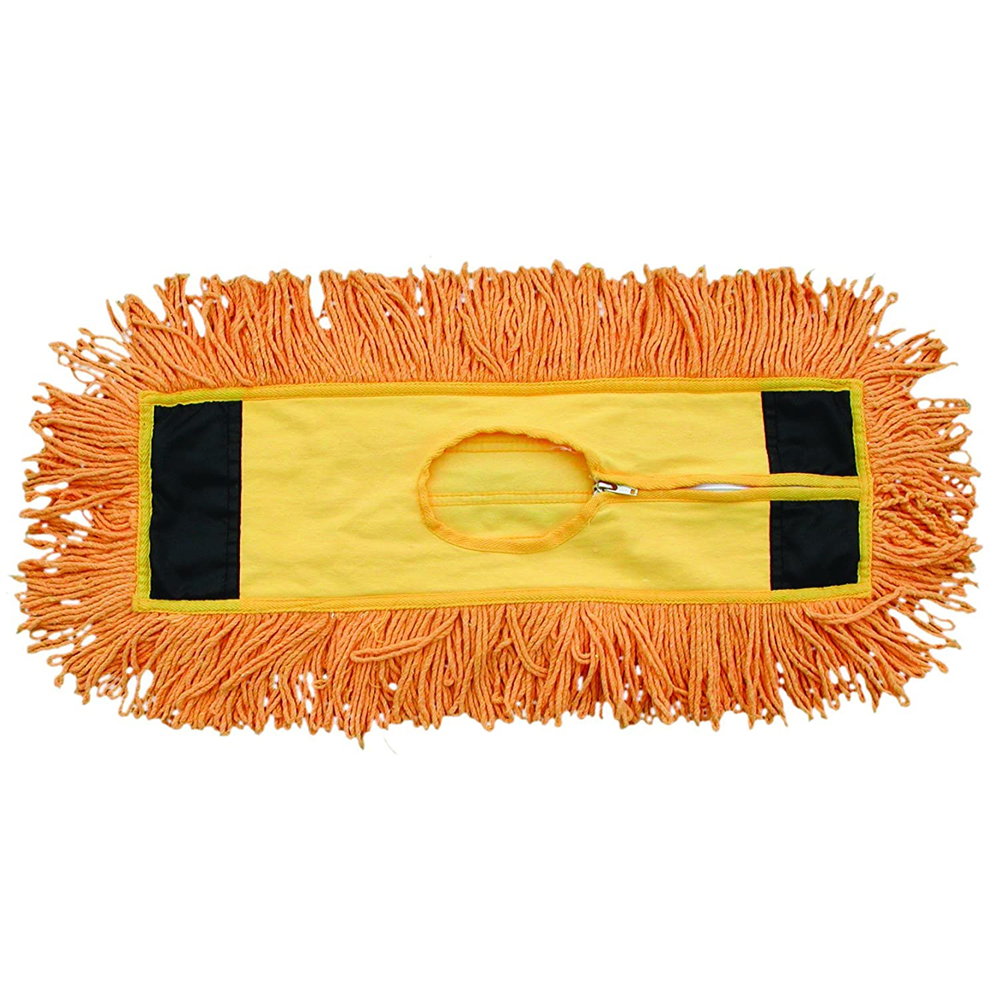 Industrial quality colored looped end dust mops. Mop heads are made of absorbent cotton yarn evenly sewn on Sanforized duck. Convenient no rust zipper for easy changing of mop head.