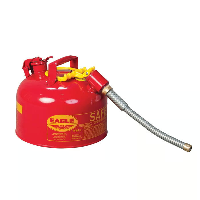 Eagle 2.5 Gallon Type-II Safety Can (U226S) feature two openings, one with a pressure-relief spring closing lid for filling, one with an actuated pour valve with a flexible metal spout for safer controlled dispensing. The filler spout and flame arrestors in both openings are non-sparking brass designed for flashback protection. Can includes a 7/8" flexible metal spout and a red (for gasoline and other flammable liquids) powder coat finish with a trilingual label. FM, UL, and ULC Approved and meet OSHA and NFPA Code 30 requirements. Compliance: OSHA 29 CFR 1910.106, 1925.152 and NFPA Code 30.