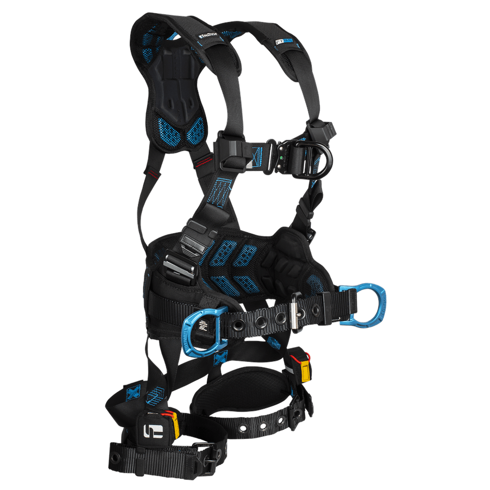 The FallTech FT-One 8127BFD2X is a premium 4D construction climbing full body harness engineered for superior comfort and all-day productivity. It features innovative Comfort Legs lateral strap construction to enhance mobility and a Modular Belt System for customizable tool bag configurations. This harness is designed to eliminate pressure points using advanced gel padding while providing high-strength fall protection for demanding job sites.
