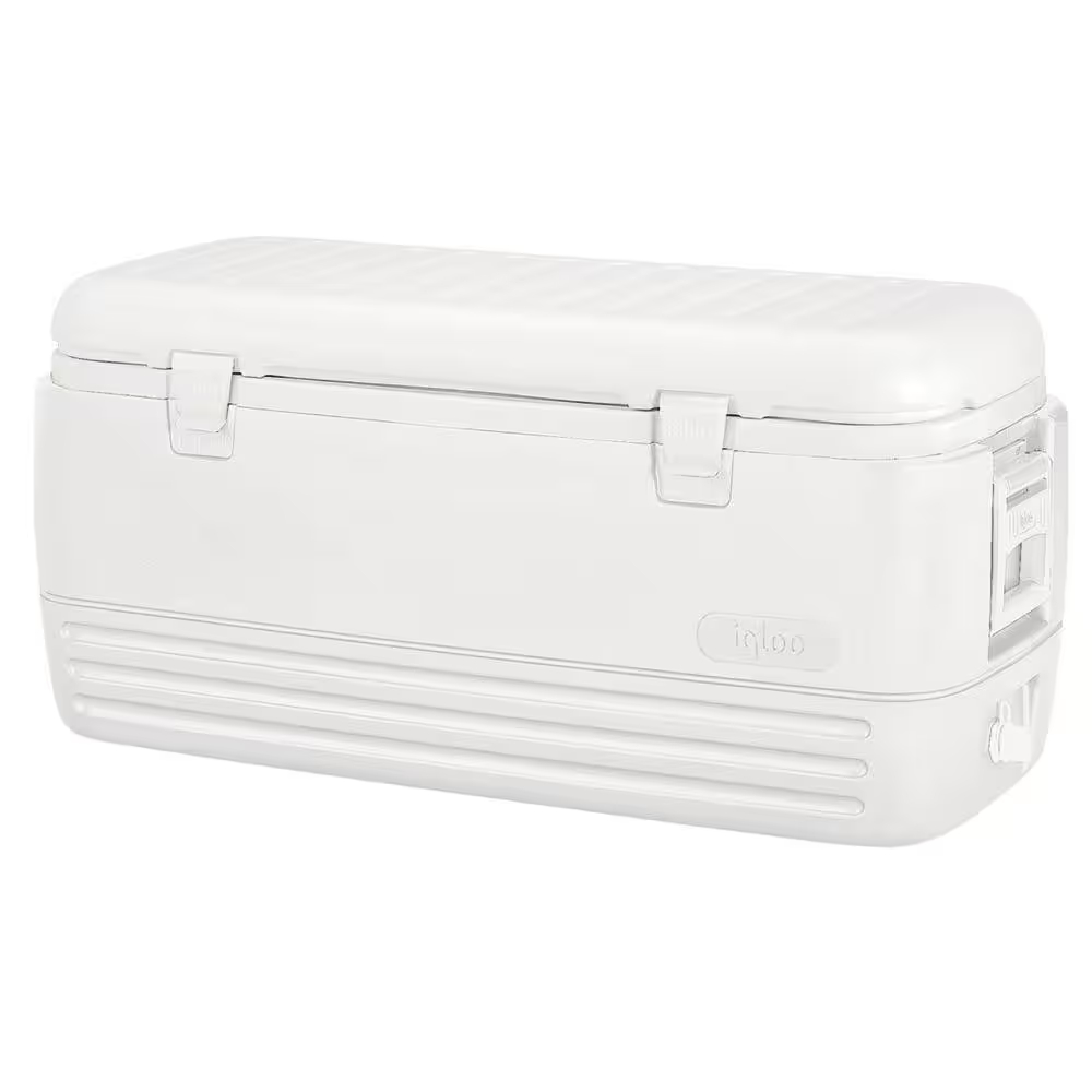 Igloo Polar 120 Cooler, White 120-Quart Insulated Chest Cooler. Features Ultratherm Insulation in both the body and lid, ensuring ice retention for up to 5 days. Reinforced swing-up handles with tie-down loop provide versatile carrying and loading options. Dual snap-fit latches keep contents secure during transportation, while the threaded drain plug allows for easy draining. With a capacity of 120 quarts, 113 liters, or 188 cans, this cooler is perfect for large gatherings and outdoor adventures.