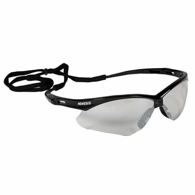 Nemesis Safety Glasses have polycarbonate lenses that provide 99.9% UVA/ UVB/UVC protection to help prevent eye damage like cataracts, retinal damage, and other conditions that can cause temporary vision loss., The wraparound frame has a base curve of 8 that extends the range of peripheral protection, as well as soft touch temples for comfort. The Nemesis safety glasses have a patented nose piece designed to be extremely flexible, to channel sweat away from the eyes, and to help prevent slippage down the nose – all for long-term comfort. Each pair of KleenGuard Nemesis safety glasses come with a neck cord for securing them, so that the glasses are ready to protect at a moment's notice. The safety eyewear is manufactured to comply with the ANSI / ISEA Z87.1+ standard for personal eye protection.