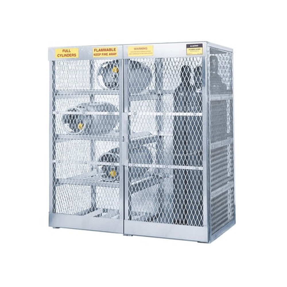 This Justrite cabinet locker combo stores 8 horizontal LPG and 10 vertical compressed gas cylinders. Constructed from 100% welded aluminum, it meets NFPA and OSHA safety regulations.