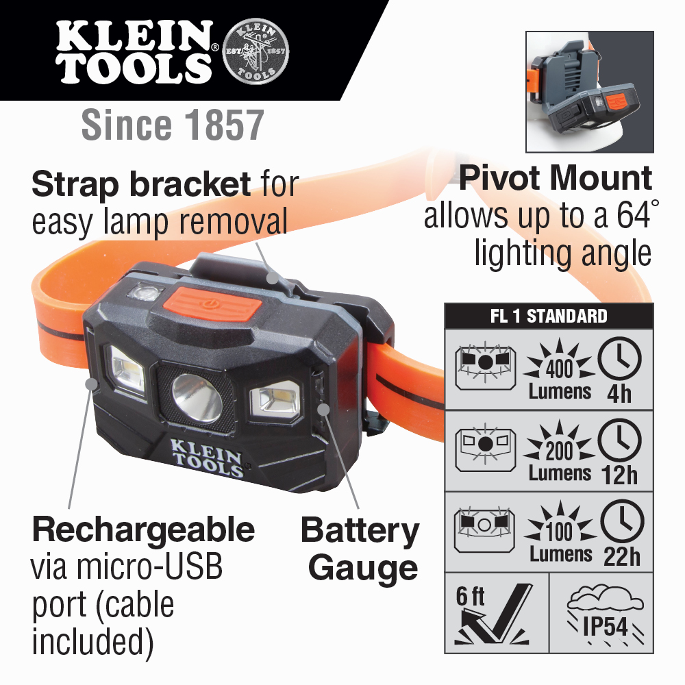 Klein Tools' rechargeable headlamp provides three lighting modes with up to 400 lumens and 22-hour runtime. It features a battery gauge, adjustable silicone strap, and attaches to Klein hard hats.