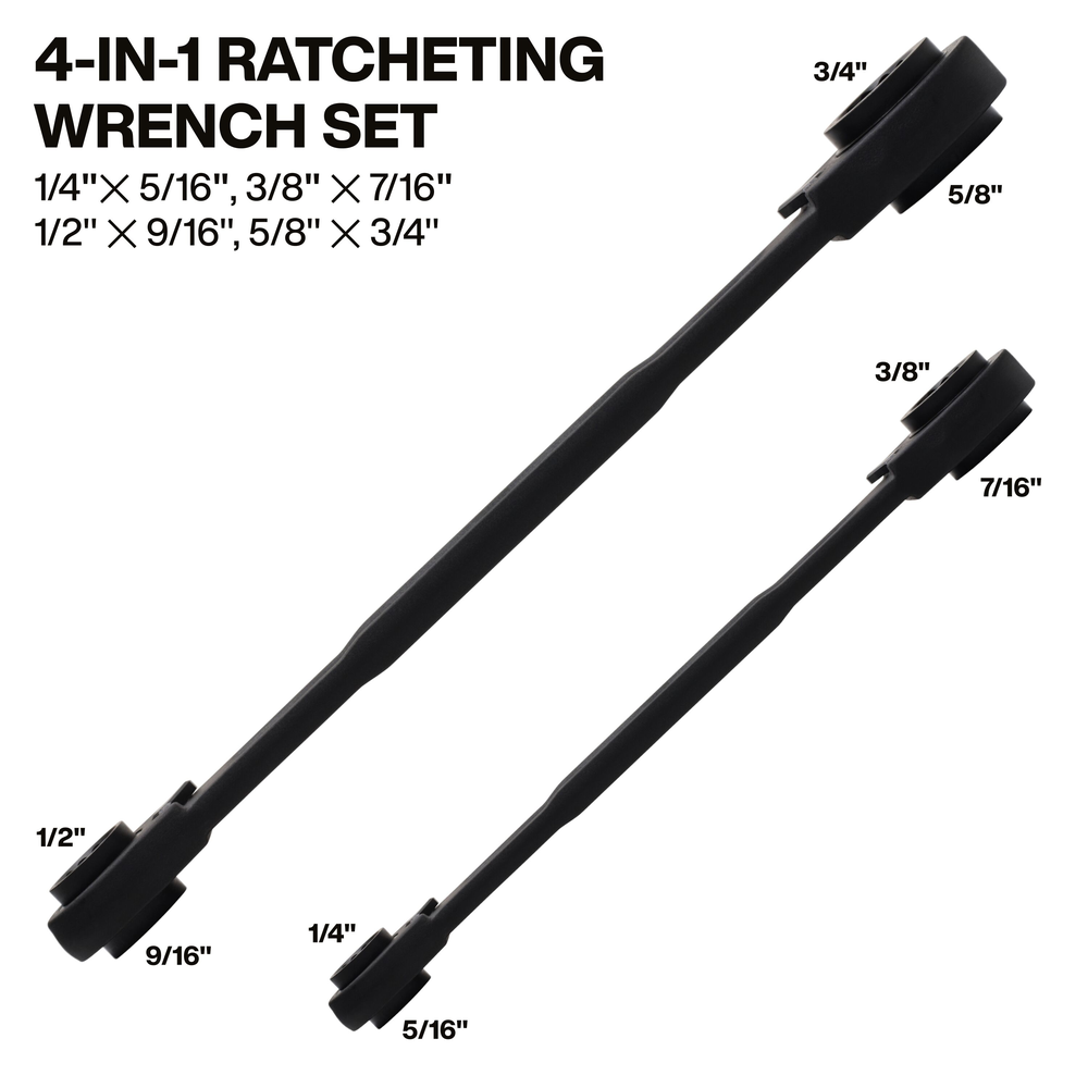 Eight hex sizes in two wrenches: 1/4, 5/16, 3/8, 7/16, 1/2, 9/16, 5/8, and 3/4-Inch