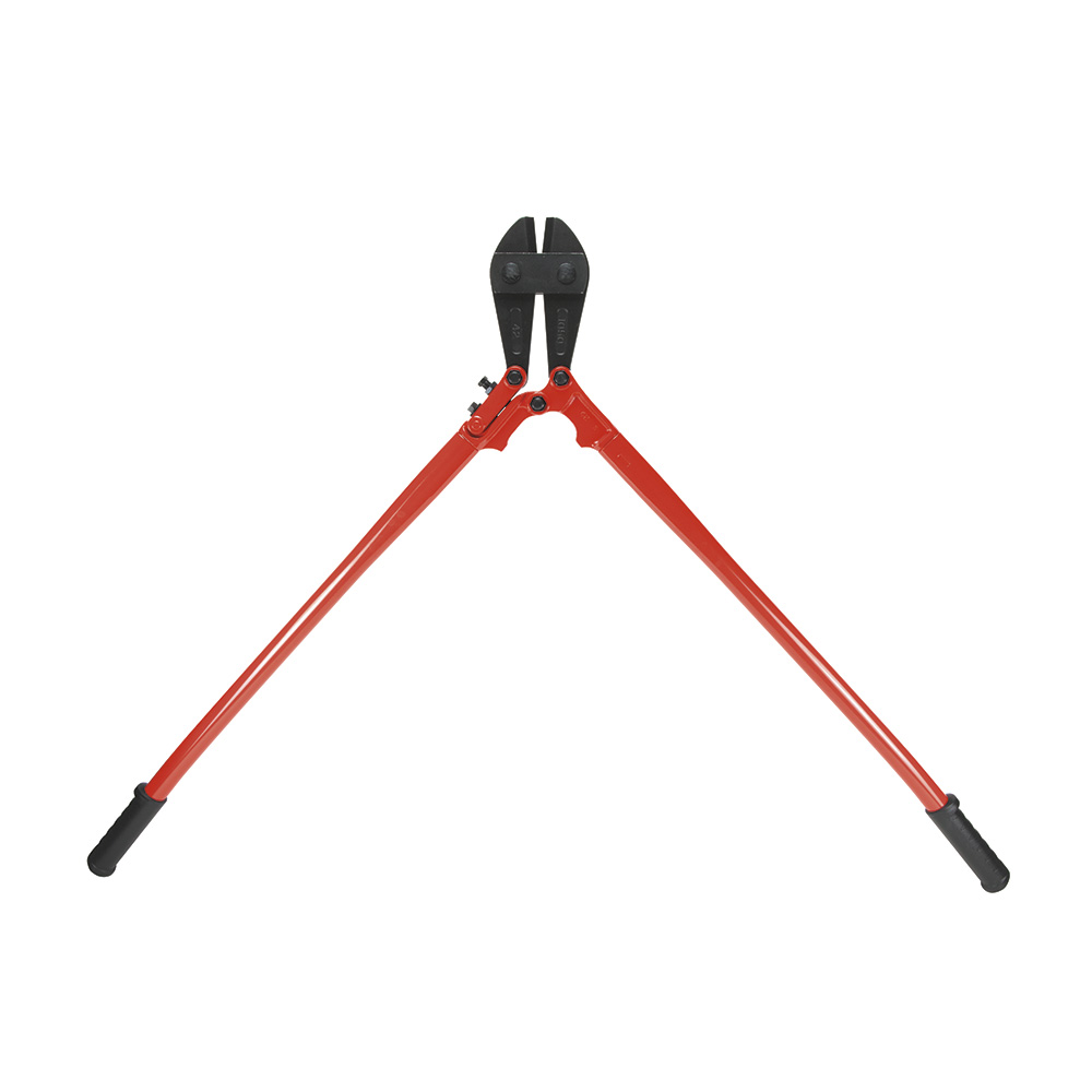 This 42-inch bolt cutter features all-purpose center-cut jaws for cutting soft, medium, and hard metals. It has red steel handles with heavy vinyl grips and flat grip ends for 90-degree cuts.