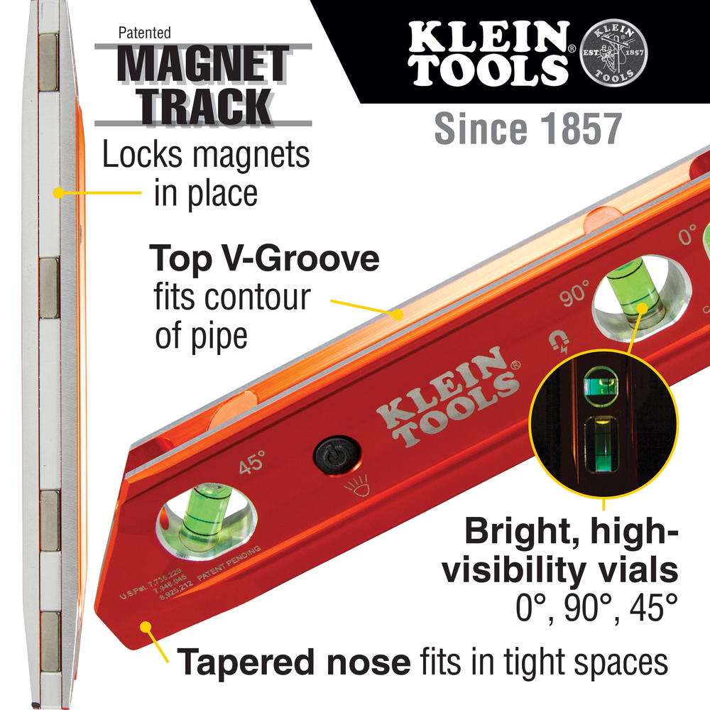 The Klein Tools 9-Inch Lighted Aluminum Billet level is designed for effective leveling on and off construction sites. It features large LED-illuminated vials for easy reading in any lighting condition and powerful rare-earth magnets secured by a patented magnet track.