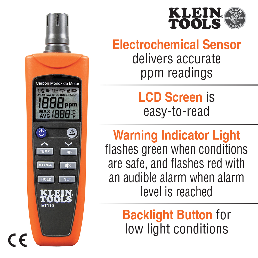 The ET110 CO Detector is an easy-to-use meter that detects and measures concentration levels of carbon monoxide (ppm) and temperature. It includes carrying pouch and 4 x AAA batteries.