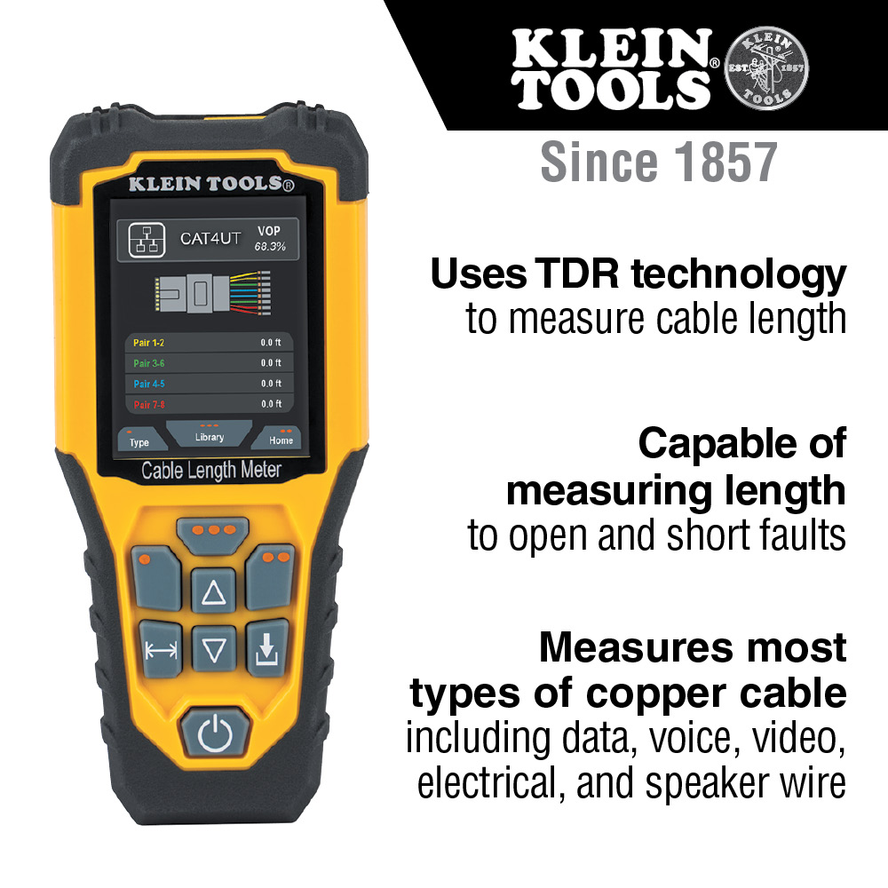 The Klein Tools Cable Length Meter is a portable Time Domain Reflectometry (TDR) cable length tester. It measures cable length, calibrates Velocity of Propagation (VoP) values, finds distance to faults, and provides built-in tone generation.