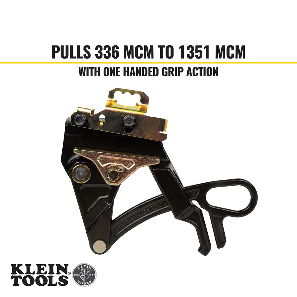The Klein Tools Wide Range Transmission Grip with Hot Latch securely pulls ACSR, AAC and bare copper cables. It holds cable sizes from 0.68-Inch to 1.42-Inch with a maximum safe load of 12,000 pounds.