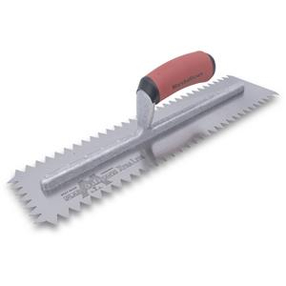 MARSHALLTOWN Scratcher Trowel with V-shaped notches ideal for scoring plaster or stucco to form a strong bond between coats, resulting in a professional quality finish. Features a high-grade spring steel blade notched on three sides with aluminum mounting and a soft grip DuraSoft handle for comfort.