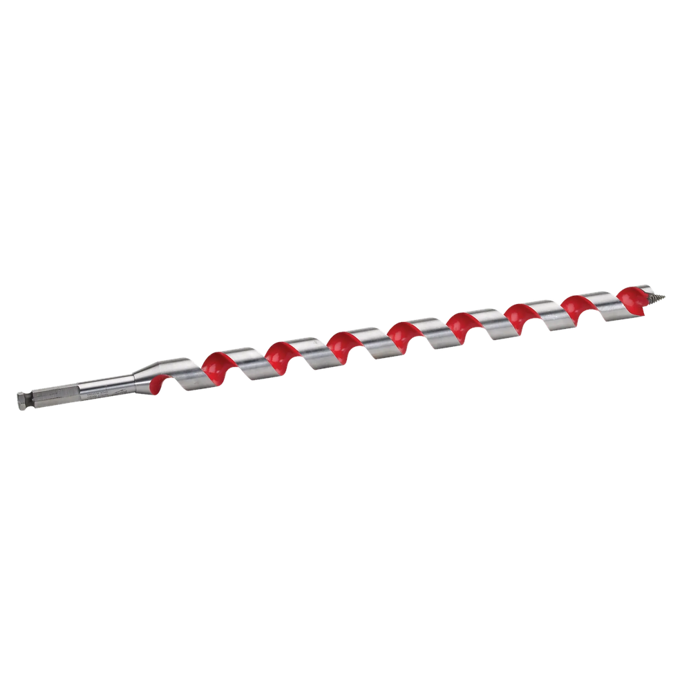 The Milwaukee 1' x 18' Ship Auger Bit is engineered for efficient and durable wood drilling. It is designed to easily penetrate clean or nail-embedded wood, making it ideal for applications such as installing wire, Pex water lines, rebar, bolts, and rope in various structures like piers, playground equipment, and landscaping projects. Its advanced design ensures it can handle multiple nails without needing frequent resharpening, offering long-lasting performance. The bit's construction prioritizes fast chip removal and a clean hole finish, reducing labor and improving efficiency for professionals and DIYers alike.