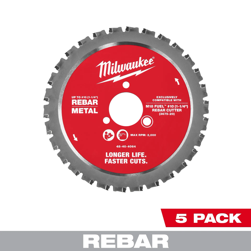 The Milwaukee 48-40-4065 #10 (1-1/4) Rebar Cutting Blade is engineered to deliver professional-grade performance with longer life and significantly faster cuts in heavy-duty metal applications. Featuring advanced cermet-tipped carbide teeth, these blades offer exceptional durability and the ability to perform cold cuts with far fewer sparks than traditional abrasive wheels. This 5-pack of blades is the ideal solution for high-volume cutting of rebar, threaded rod, and black iron pipe on demanding jobsites.