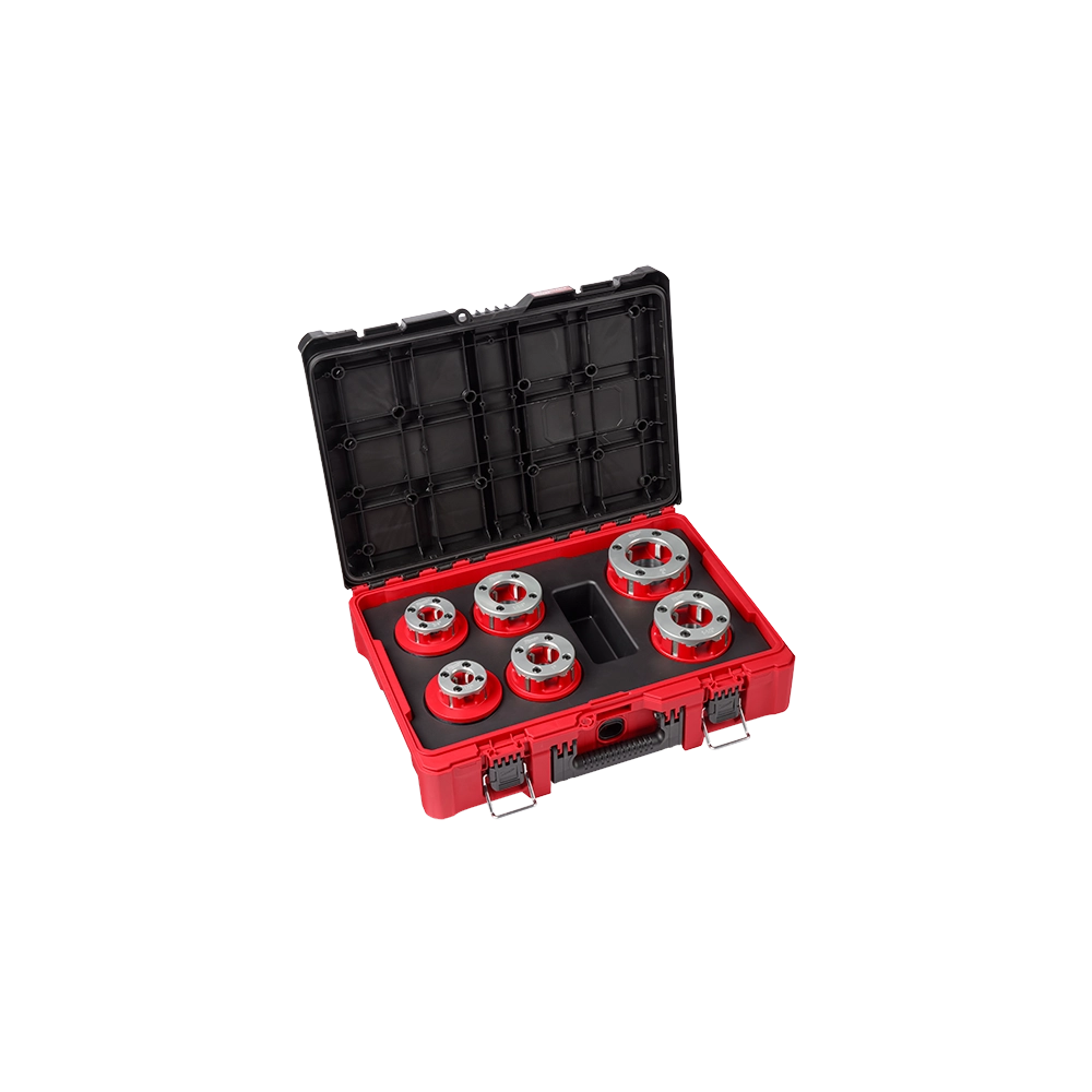 The Milwaukee 48-36-1060 is a professional-grade 1/2'-2' High Speed NPT Portable Pipe Threading Kit featuring the industry's lightest forged aluminum die heads. Engineered from military-grade aluminum, these die heads offer up to 50% lower weight than traditional cast iron alternatives, significantly reducing operator fatigue during repetitive threading tasks. The design incorporates 25% larger slots for superior visibility and smoother chip clearance, ensuring a high-quality threading process with minimal nesting. This versatile kit is fully compatible with the Milwaukee M18 FUEL 2' Pipe Threader as well as leading competitive power drives.