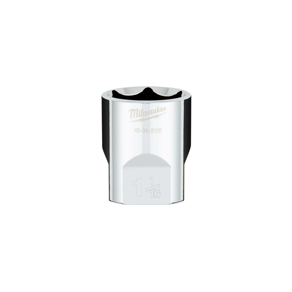 The Milwaukee 1/2' Drive 1-1/16' SAE 6-Point Socket is engineered for maximum versatility and durability on the job site. It features an innovative FOUR FLAT side design that prevents the socket from rolling on uneven surfaces and makes it wrench-compatible for added leverage. The high-visibility stamped size markings ensure quick identification, even in greasy or low-light conditions. Designed with optimized 6-point geometry, this socket reduces the risk of bolt rounding and stripping during high-torque applications.