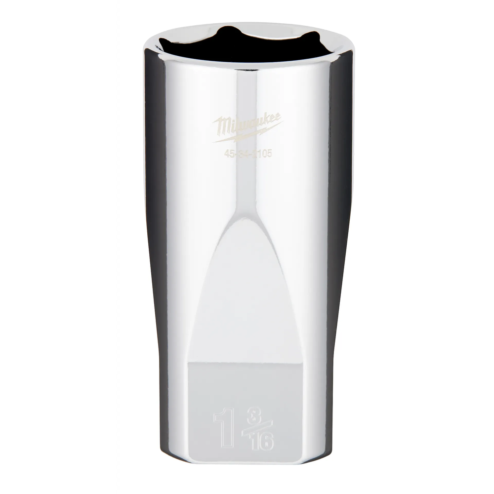The MILWAUKEE 1/2' Drive 1-3/16' SAE 6-Point Deep Well Socket is engineered from the ground up to provide maximum versatility and durability for professional users. Featuring an innovative FOUR FLAT side design, this socket stays exactly where you put it by deterring rolling on work surfaces and remains compatible with wrenches for added torque when needed. The optimized 6-point geometry is specifically designed to reduce bolt rounding and stripping, ensuring a long life for both the tool and your fasteners.