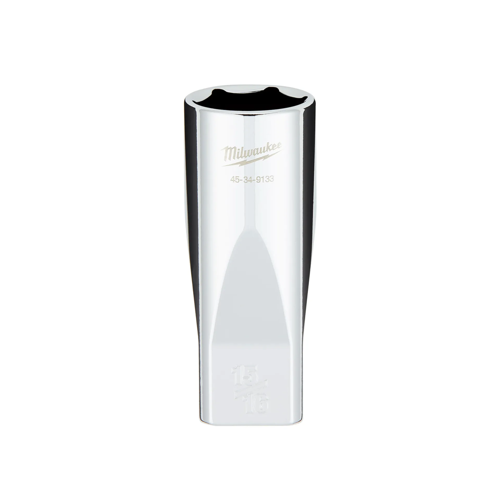The MILWAUKEE 1/2' Drive 15/16' SAE 6-Point Deep Socket with FOUR FLAT Sides is engineered from the ground up to provide maximum versatility and durability for trade professionals. This socket features an innovative design with four parallel flat sides that deter rolling on the job site and are fully wrench-compatible for added leverage. Optimized deep well geometry effectively reduces bolt rounding and stripping, ensuring long-term reliability in demanding applications. Large, stamped sizes offer improved visibility, while the chrome vanadium steel construction provides the strength needed for heavy-duty use.