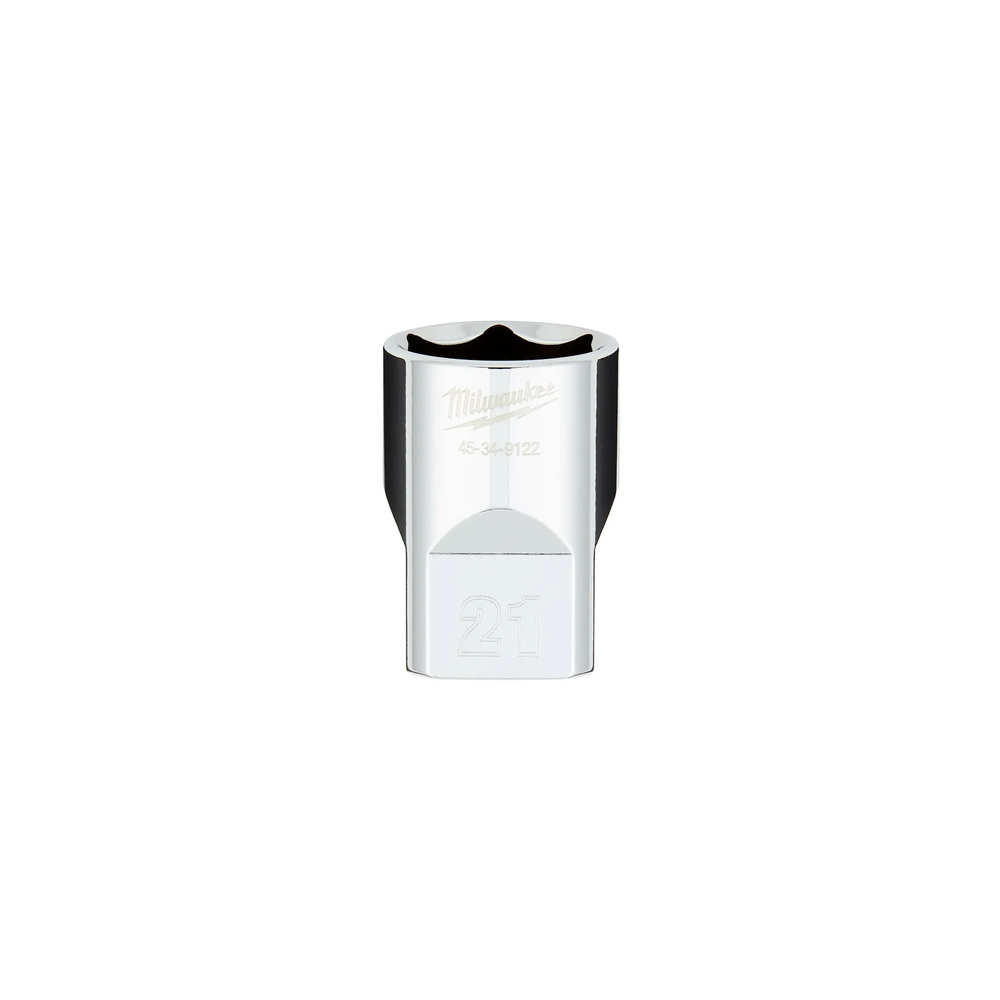 The MILWAUKEE 1/2' Drive 21MM Metric 6-Point Socket with FOUR FLAT Sides is engineered from the ground up to provide maximum versatility and durability in professional environments. Featuring an innovative design with four parallel flat sides, this socket is specifically crafted to deter rolling on surfaces and is wrench-ready for added leverage. The optimized socket geometry significantly reduces the risk of bolt rounding and stripping, while stamped sizes offer long-lasting visibility. Backed by a lifetime guarantee, this chrome-finished socket is a reliable addition to any mechanic's toolkit.