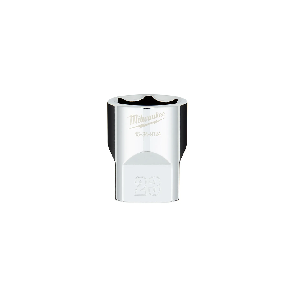 The Milwaukee 1/2' Drive 23MM Metric 6-Point Socket with FOUR FLAT Sides is engineered from the ground up to provide professional users with maximum versatility and durability. This socket features an innovative design with four parallel flat sides to deter rolling on the jobsite and provide wrench-compatibility for applications requiring additional torque. The large, stamped size markings offer superior visibility for quick identification, while the optimized geometry helps reduce bolt rounding and stripping. Built with a premium chrome finish for long-lasting corrosion resistance, this socket is a reliable staple for any professional toolkit and is part of the industry's most versatile socket family.