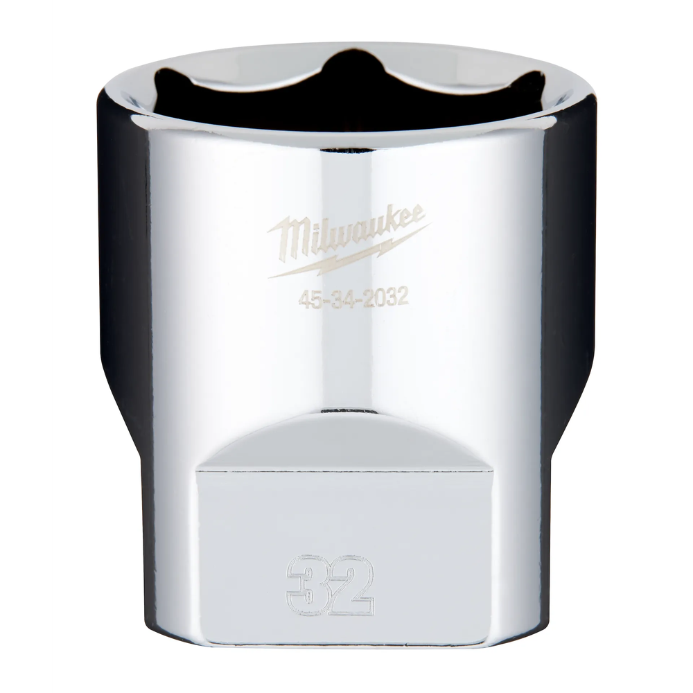 The Milwaukee 1/2' Drive 32mm Metric 6-Point Standard Socket is engineered from the ground up to provide maximum versatility and durability for professional users. Featuring an innovative FOUR FLAT side design, this socket resists rolling on uneven surfaces and provides a wrench-ready surface for applications requiring additional leverage. Stamped size markings are positioned directly on the flats for improved visibility and long-lasting readability, while the optimized internal geometry is specifically designed to reduce bolt rounding and stripping. Backed by a lifetime guarantee, this chrome-finished socket is a reliable addition to any heavy-duty tool collection.