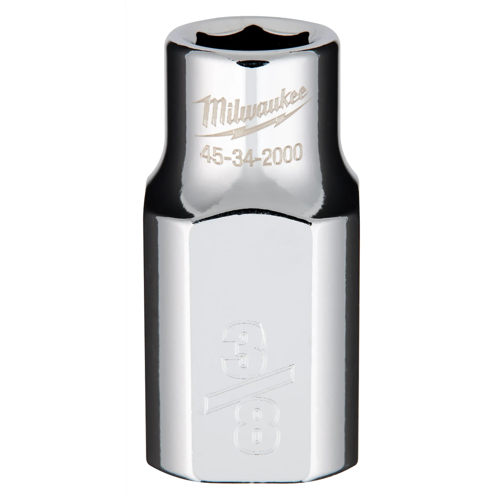 The Milwaukee 45-34-2000 is a premium 1/2' drive, 3/8' SAE standard socket designed to provide maximum versatility and durability on the jobsite. It features an innovative design with four parallel flat sides that effectively deter rolling and are wrench-compatible for applications requiring extra torque. Engineered with optimized internal geometry, this socket significantly reduces the risk of bolt rounding and stripping, ensuring a long-lasting and reliable tool for professional use.