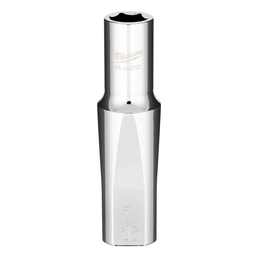 The MILWAUKEE 1/2' Drive 7/16' SAE 6-Point Deep Well Socket with FOUR FLAT Sides is engineered from the ground up to provide maximum versatility and durability. Featuring an innovative design with four parallel flat sides, this socket is designed to deter rolling and is fully wrench-compatible for applications requiring extra torque. The geometry is optimized to reduce bolt rounding and stripping, ensuring a long tool life and reliable performance in demanding job site conditions.